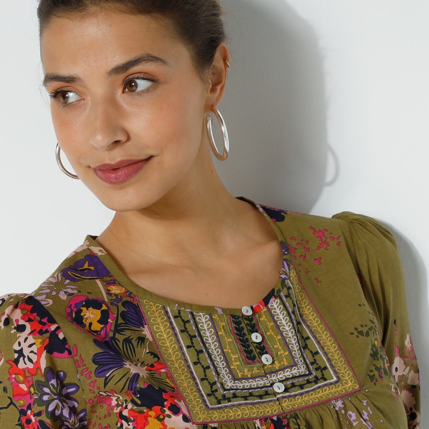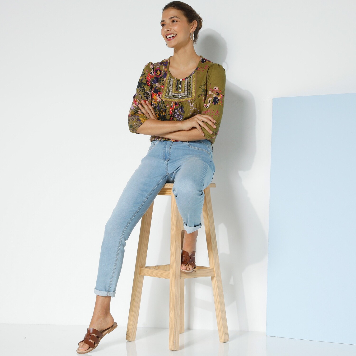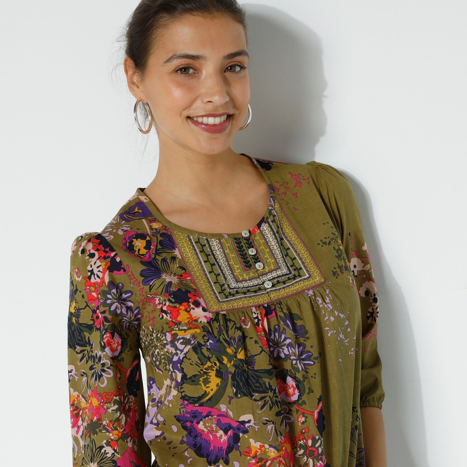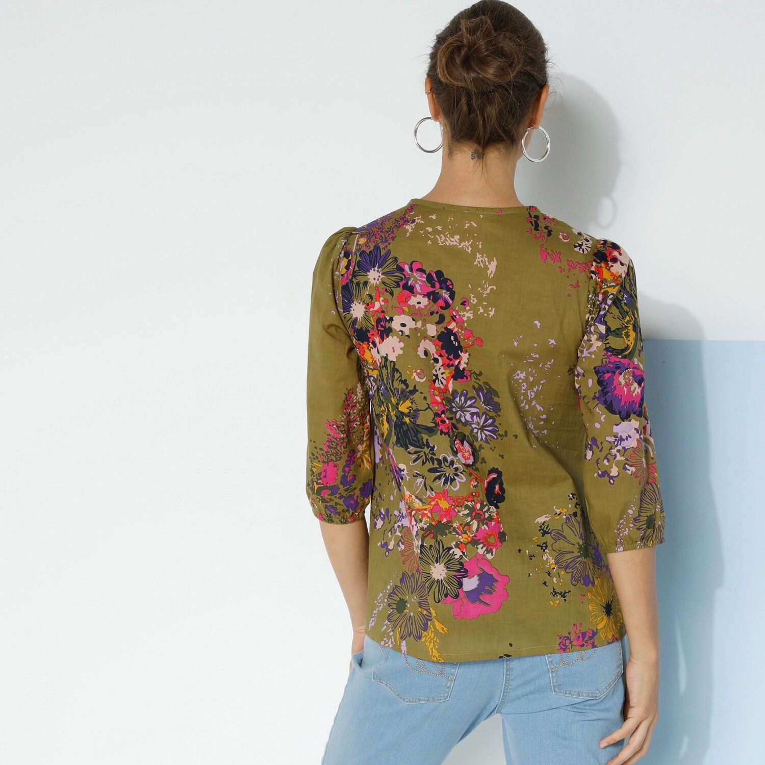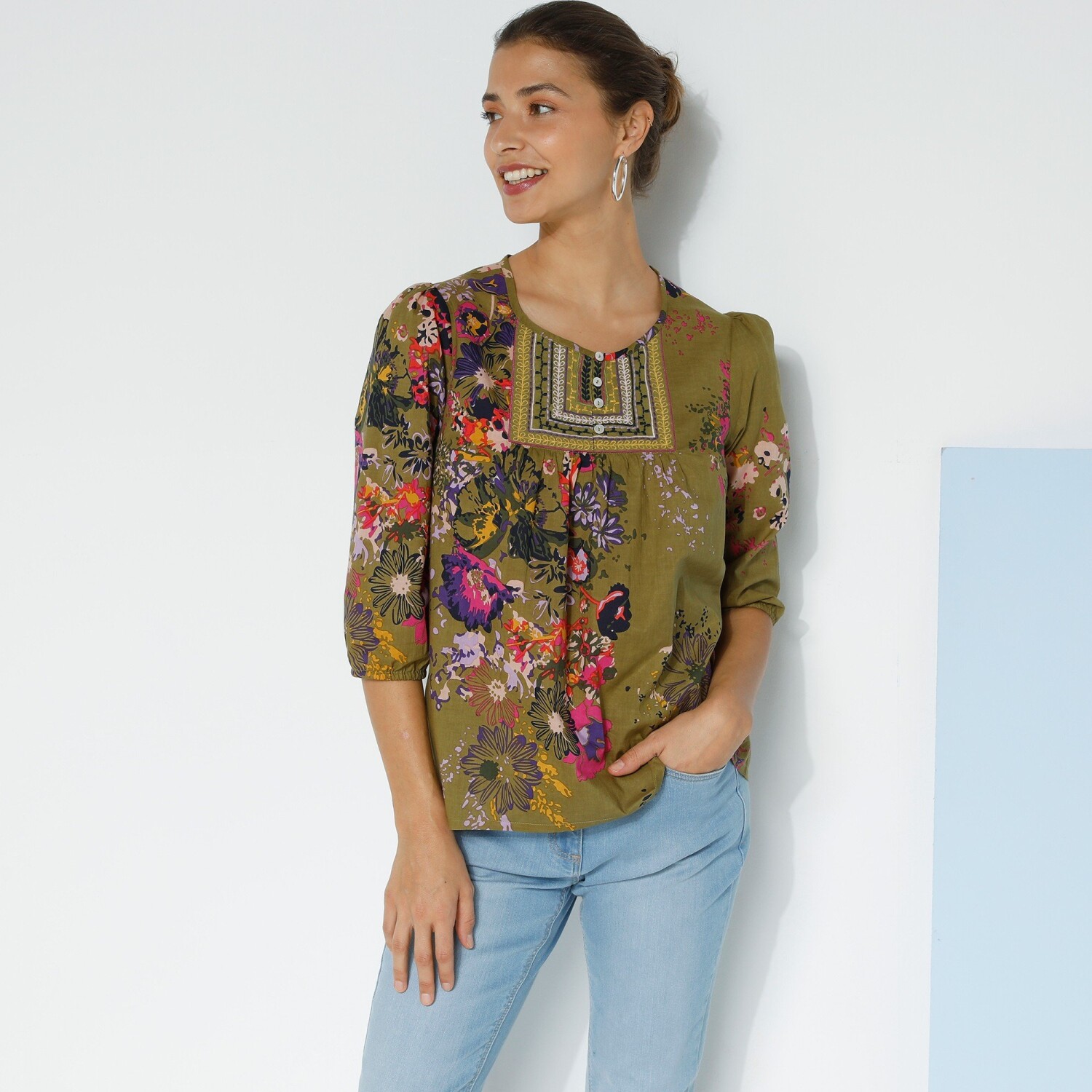 Świeżość i lekkość, taka jest ta kwiecista bluzka! Idealnie luźny model, który przyciągnie wszystkie spojrzenia! Okrągły dekolt. Haftowany śliniak z rozcięciem i guzikami. Rękawy 3/4 z elastycznym dołem. Prosty dół. Można prać w pralce.