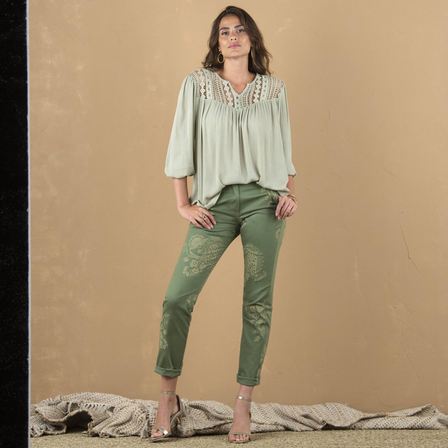 Uwodzicielska makrama i zwiewny materiał to główne zalety tej kobiecej bluzki! Uwielbiamy jej bluzkowe rękawy i pochlebną długość. Makramowa wstawka z przodu. Elastyczne rękawy 3/4 dla bluzkowego wyglądu. Prosty dół. Przewiewny krepon. Można prać w pralce.