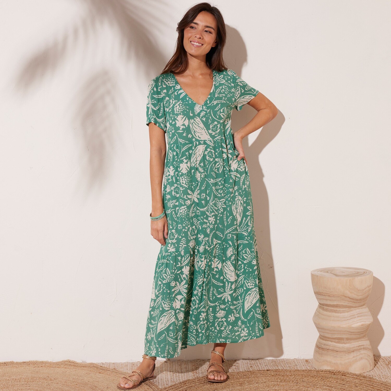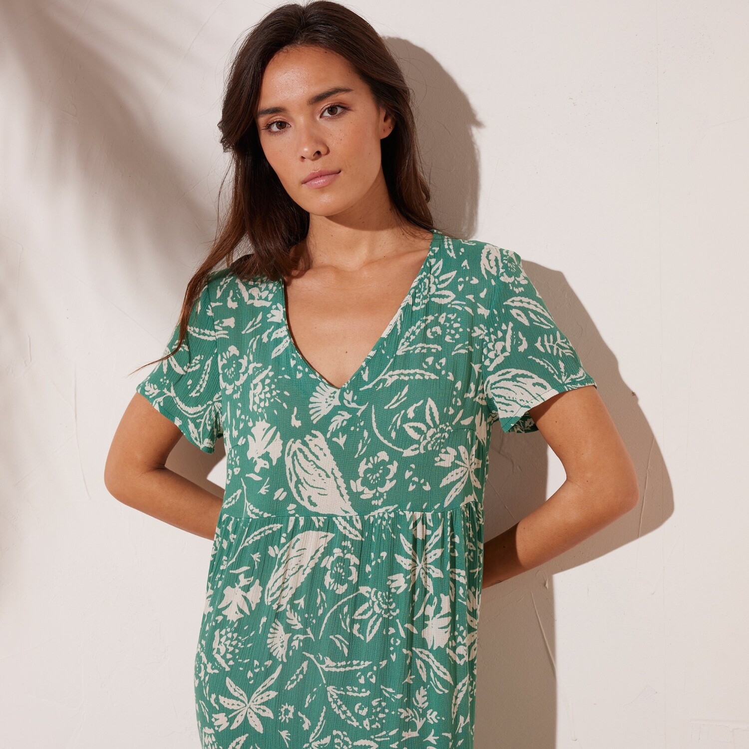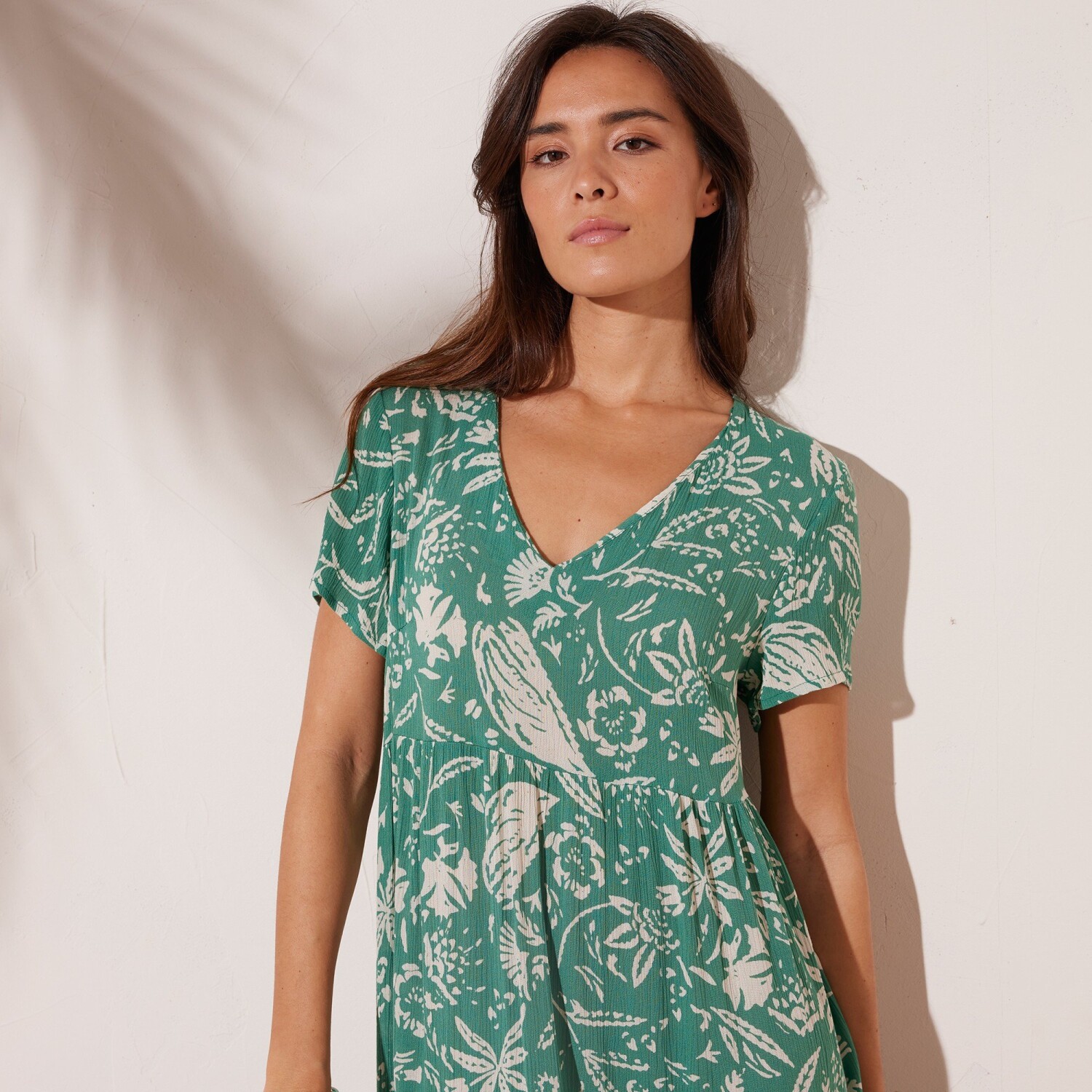 Podkreśl swoje kobiece piękno w długiej sukni z dekoltem w literę „V” i nadrukiem. Świeża lekka krepa. Przedłużony krój. Dekolt w kształcie litery „V”. Krótkie rękawy. Zakładki klatki piersiowej. Wysokie wycięcie w talii. 2 duże marszczenia u dołu. Można prać w pralce.