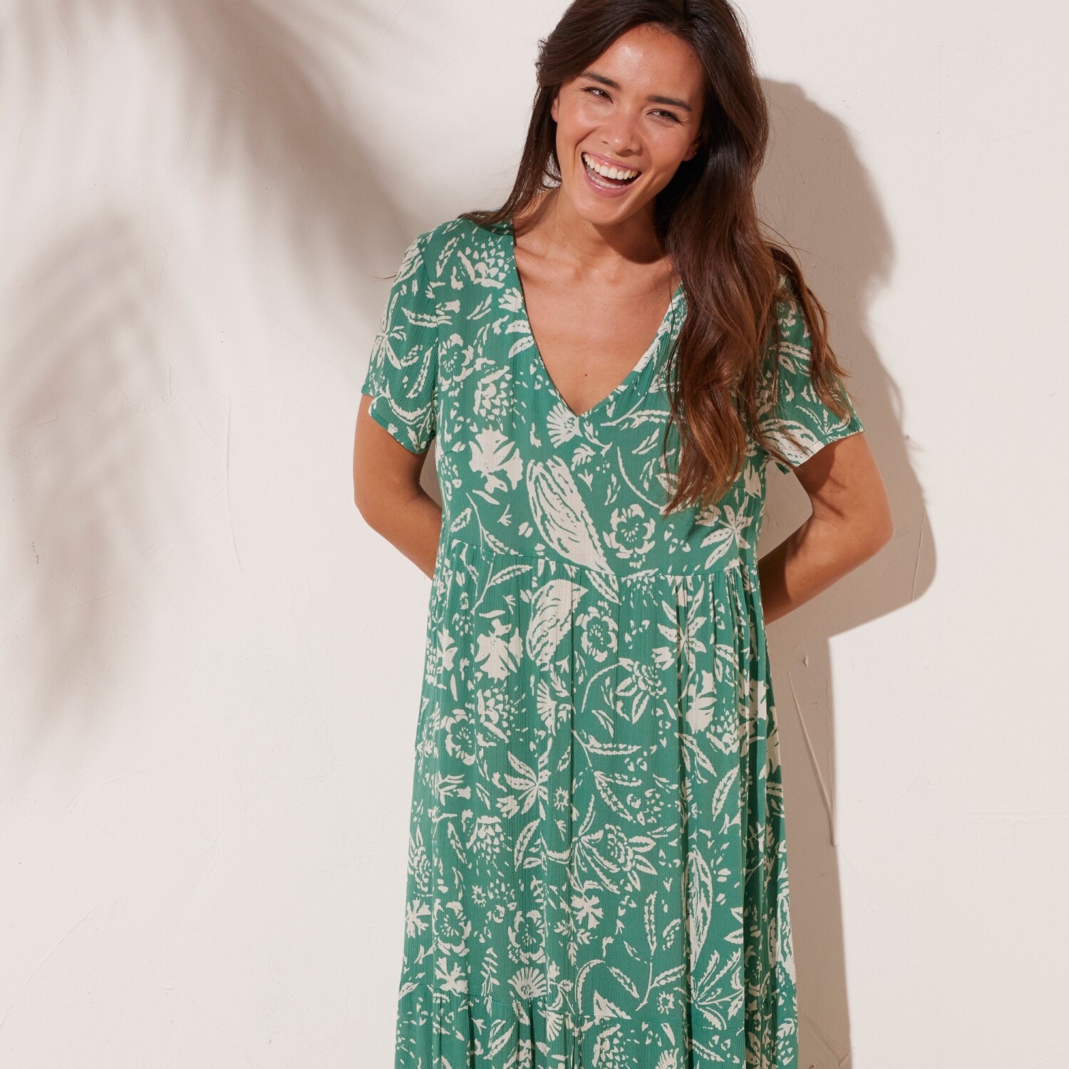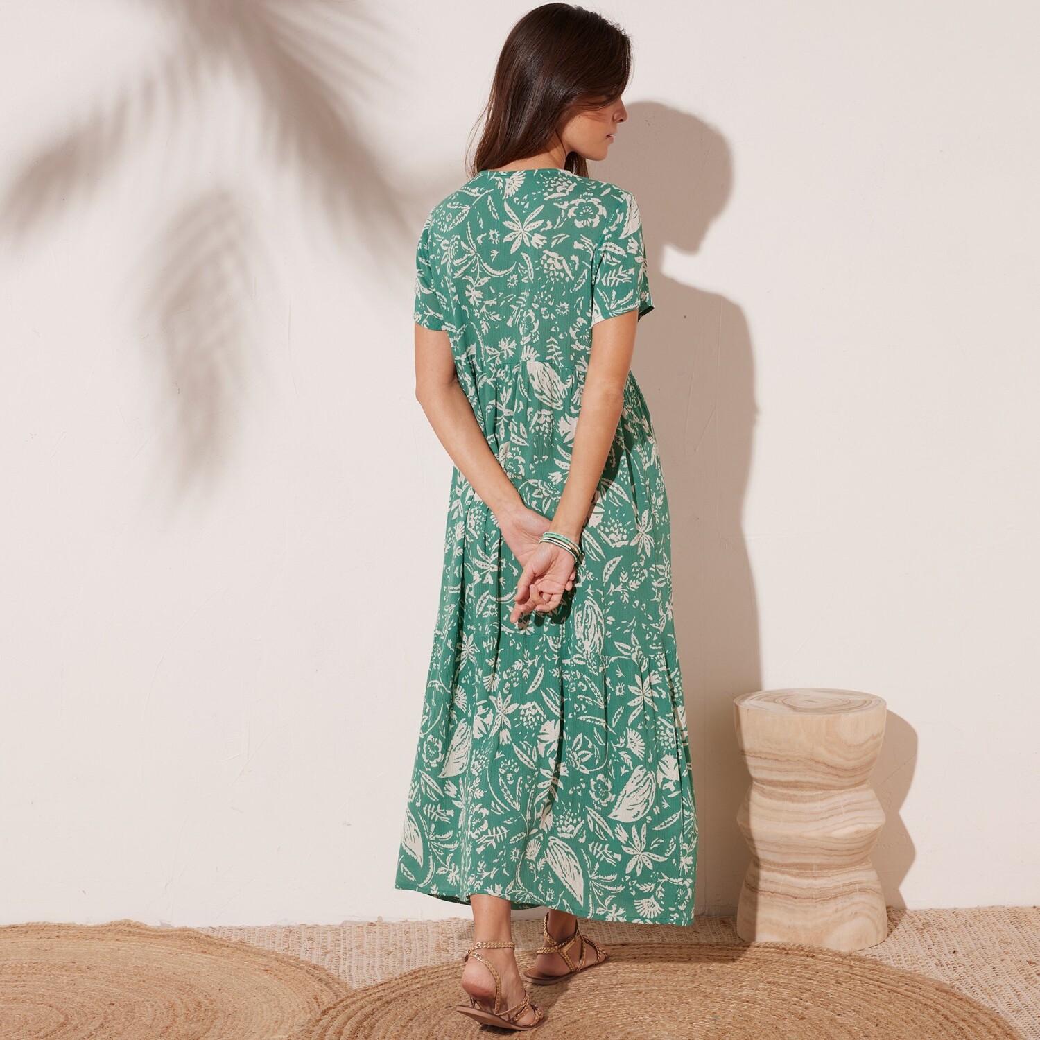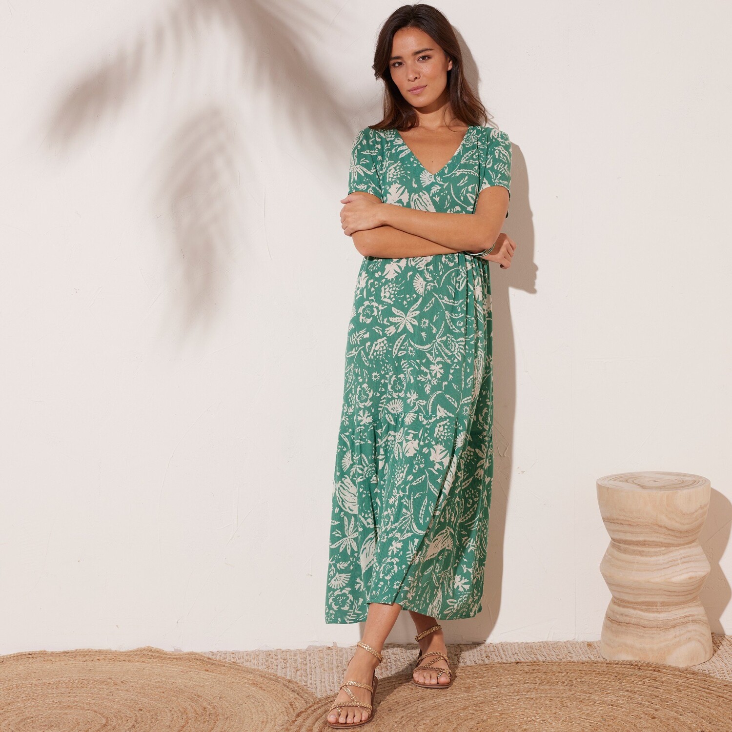 Podkreśl swoje kobiece piękno w długiej sukni z dekoltem w literę „V” i nadrukiem. Świeża lekka krepa. Przedłużony krój. Dekolt w kształcie litery „V”. Krótkie rękawy. Zakładki klatki piersiowej. Wysokie wycięcie w talii. 2 duże marszczenia u dołu. Można prać w pralce.