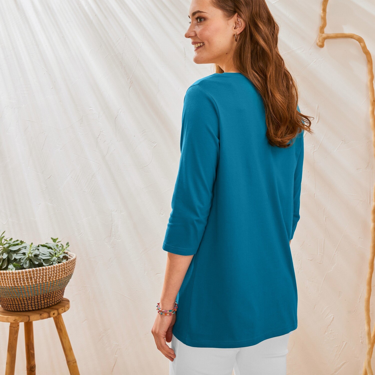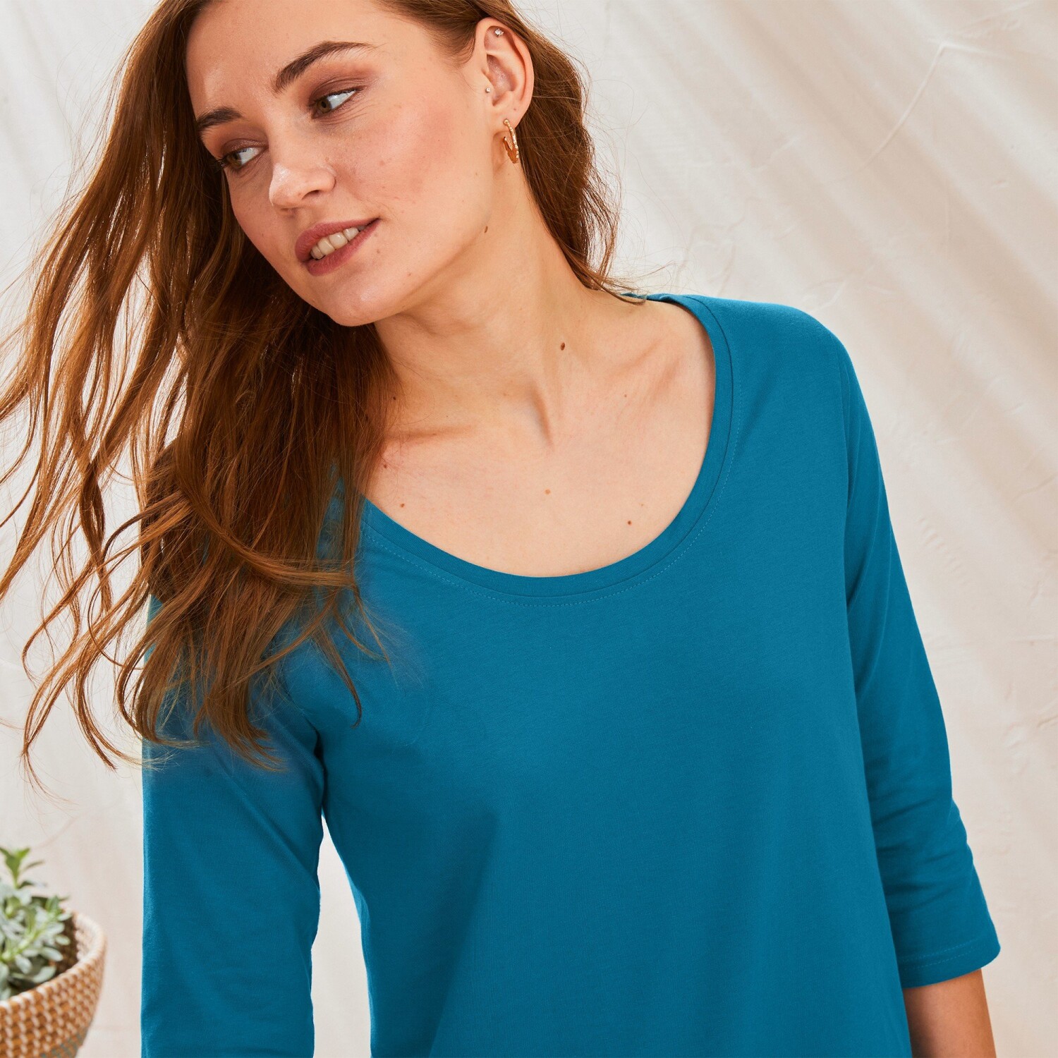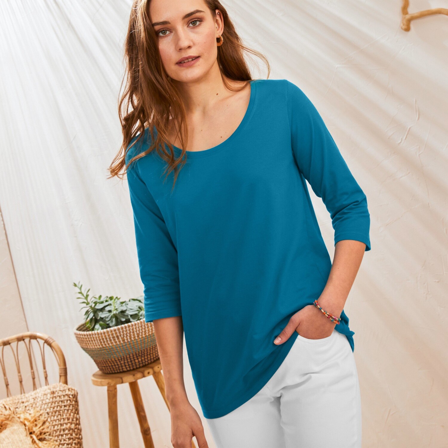 Bawełniany dżersej i słoneczna gama kolorów: koszulka z rękawem 3/4 to podstawa kobiecej garderoby! Okrągły dekolt. Rękawy 3/4. Prosty dół. Bawełniany dżersej zapewniający wygodne dopasowanie. Oeko-Tex Standard 100 (nr CQ1216/3 IFTH). Znak ten identyfikuje produkty tekstylne, które zostały poddane testom laboratoryjnym pod kątem szerokiej gamy szkodliwych substancji, a produkt jest bezpieczny ponad obowiązujące normy. Można prać w pralce.
