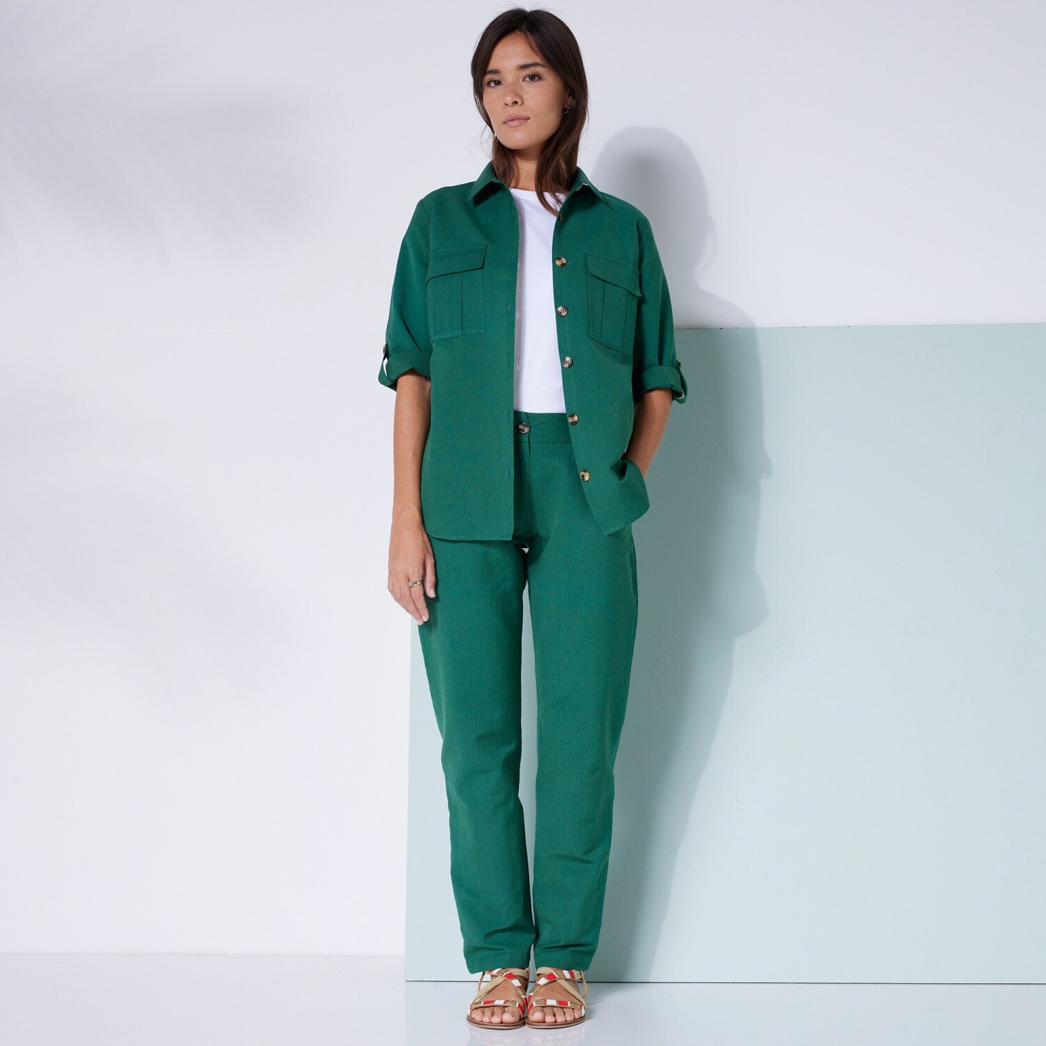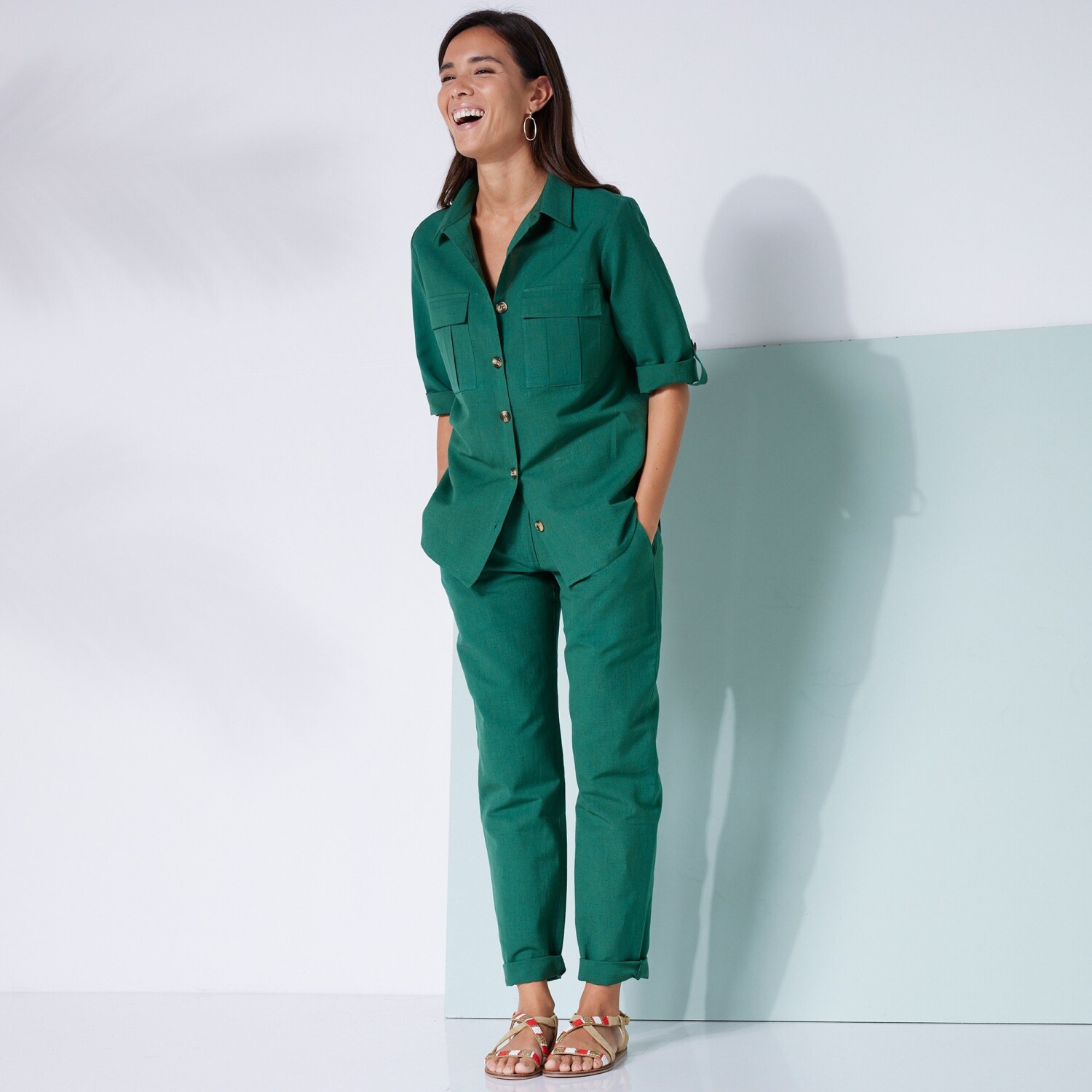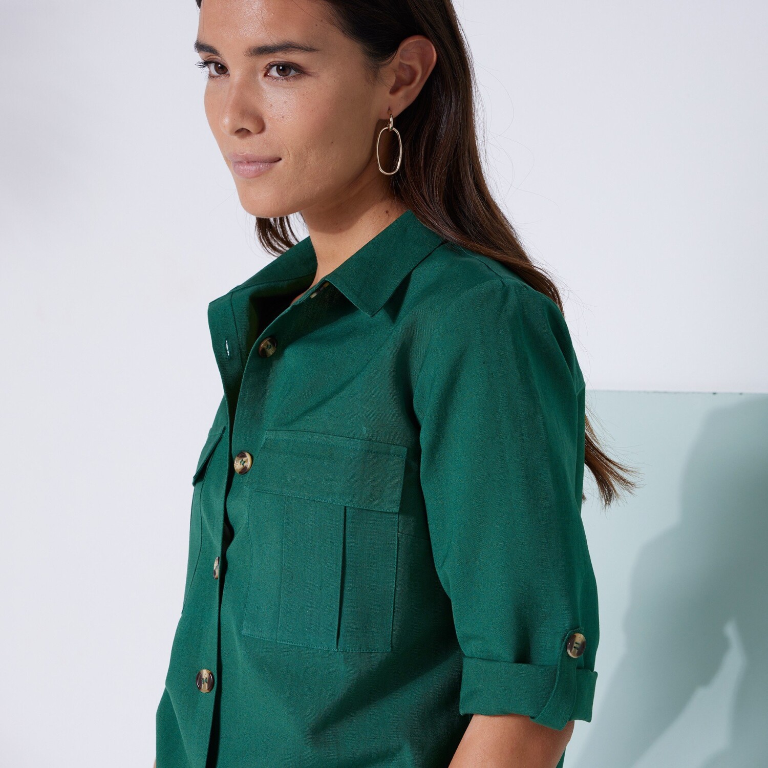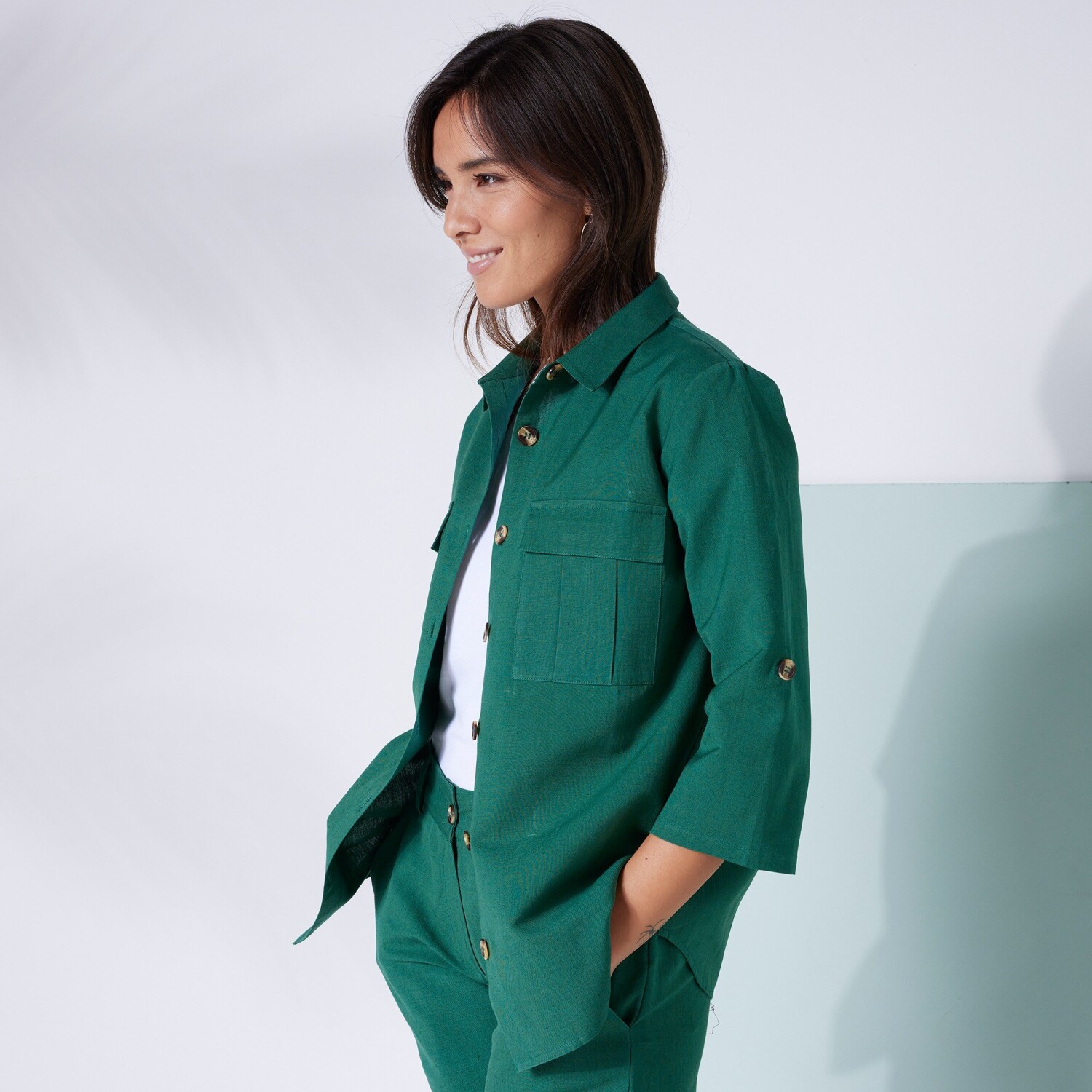 Bluzka koszulowa z bujnej mieszanki bawełny i lnu jest wygodna w noszeniu. Kołnierzyk koszulowy. 2 kieszenie na piersi ze schowkiem i klapką. Zaszewki na piersi. Zapięcie na guziki. Rękawy 3/4 z zapięciem na guziki. Lekko zaokrąglony dół. Prać w temperaturze 30°C.