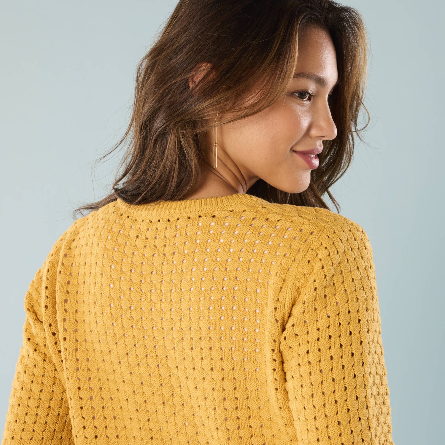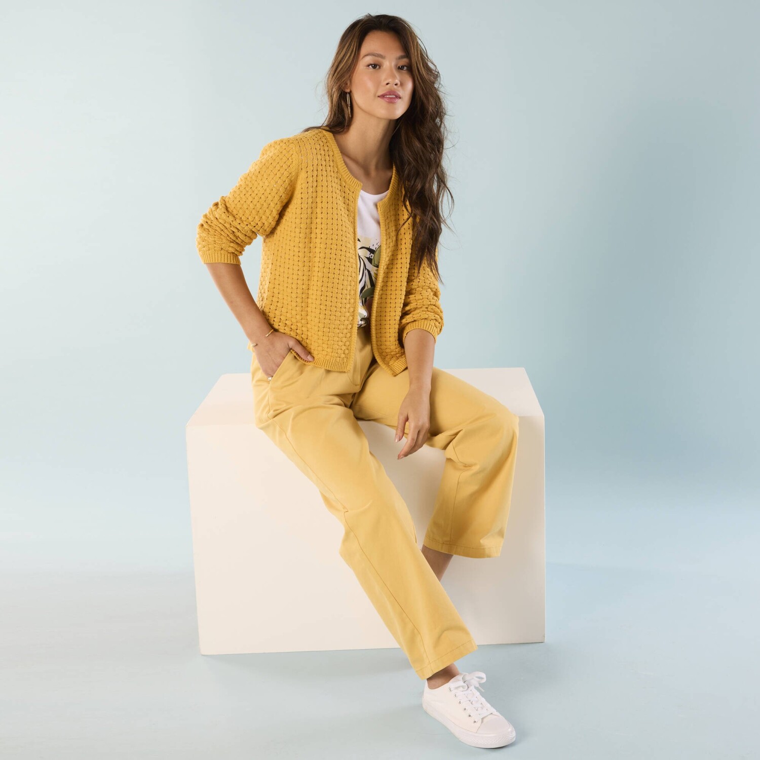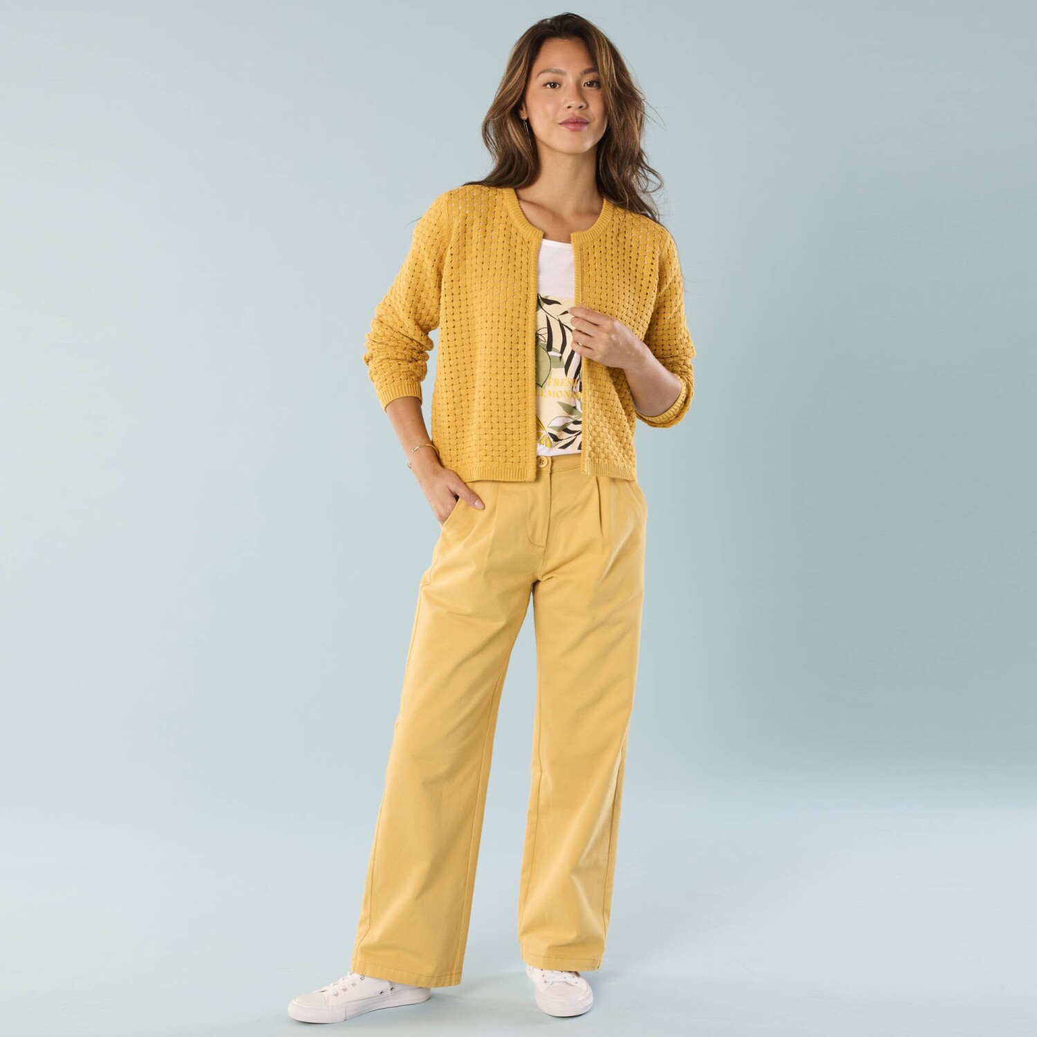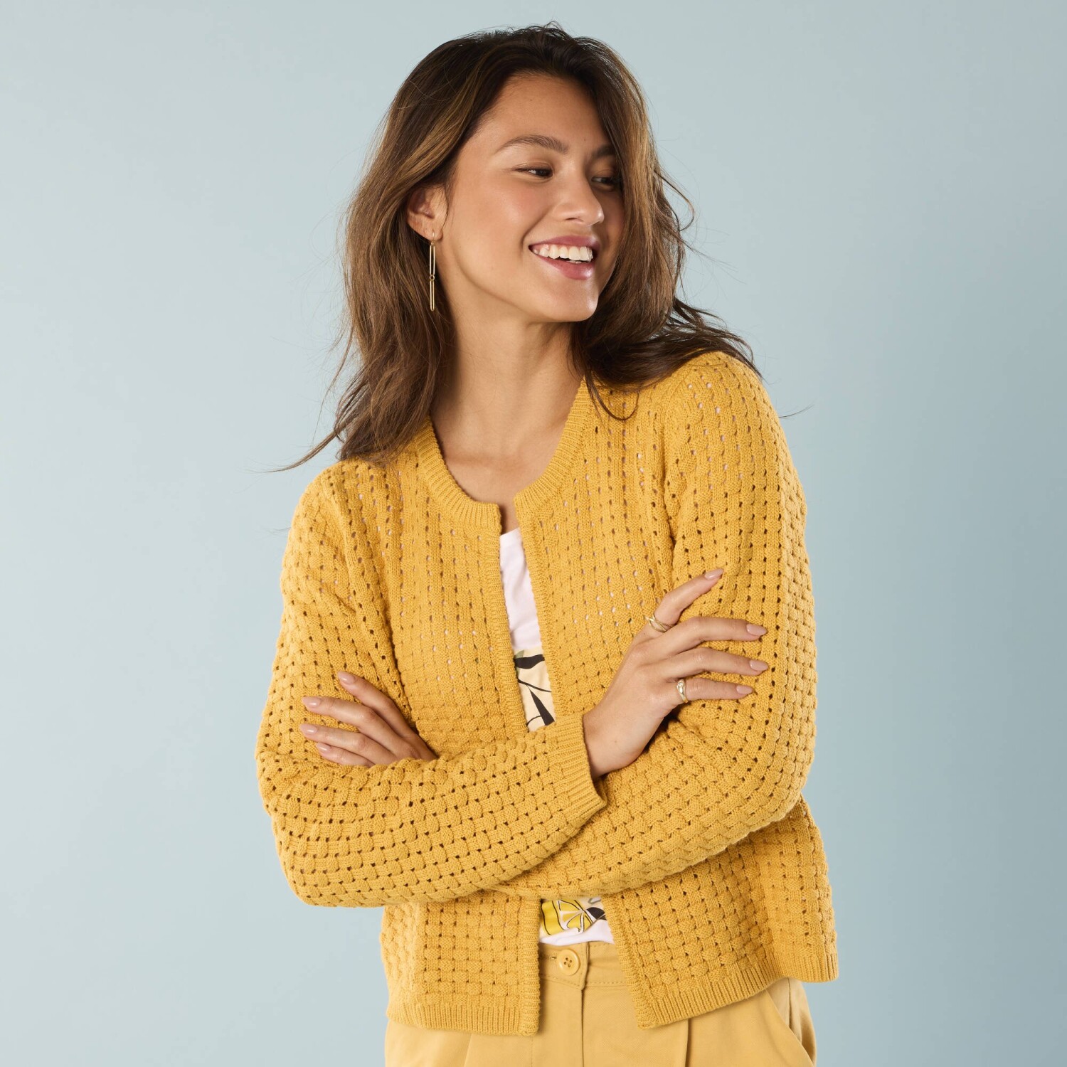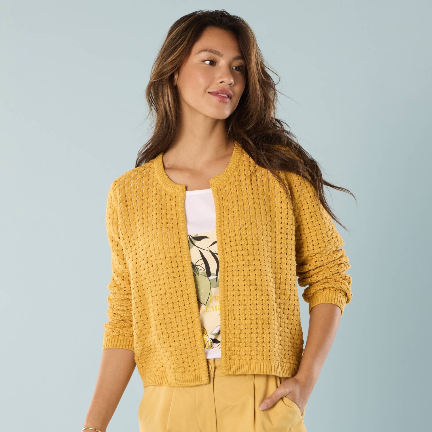 Krótki kardigan narzucony na sukienkę lub T-shirt doda oryginalności każdemu strojowi. Oryginalna dzianina o tkanym wyglądzie. Bez zapięcia. Okrągły dekolt. Długie rękawy. Prążkowane wykończenia u dołu, przy mankietach i z przodu. Prosty dół. Można prać w pralce.