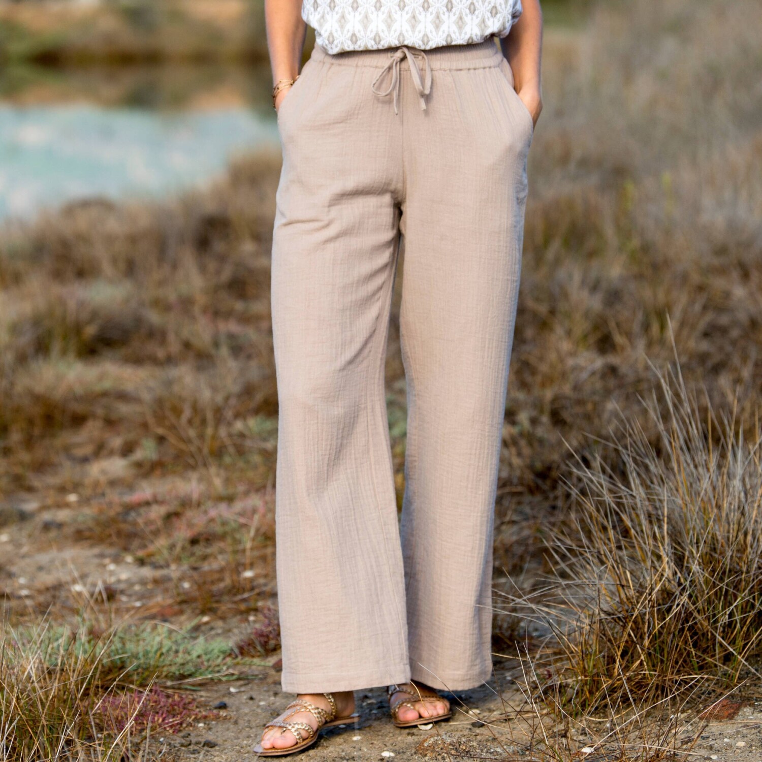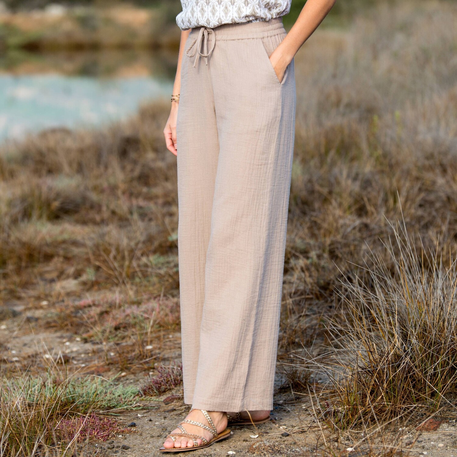 Muślinowe spodnie z wysokim stanem i szerokimi nogawkami