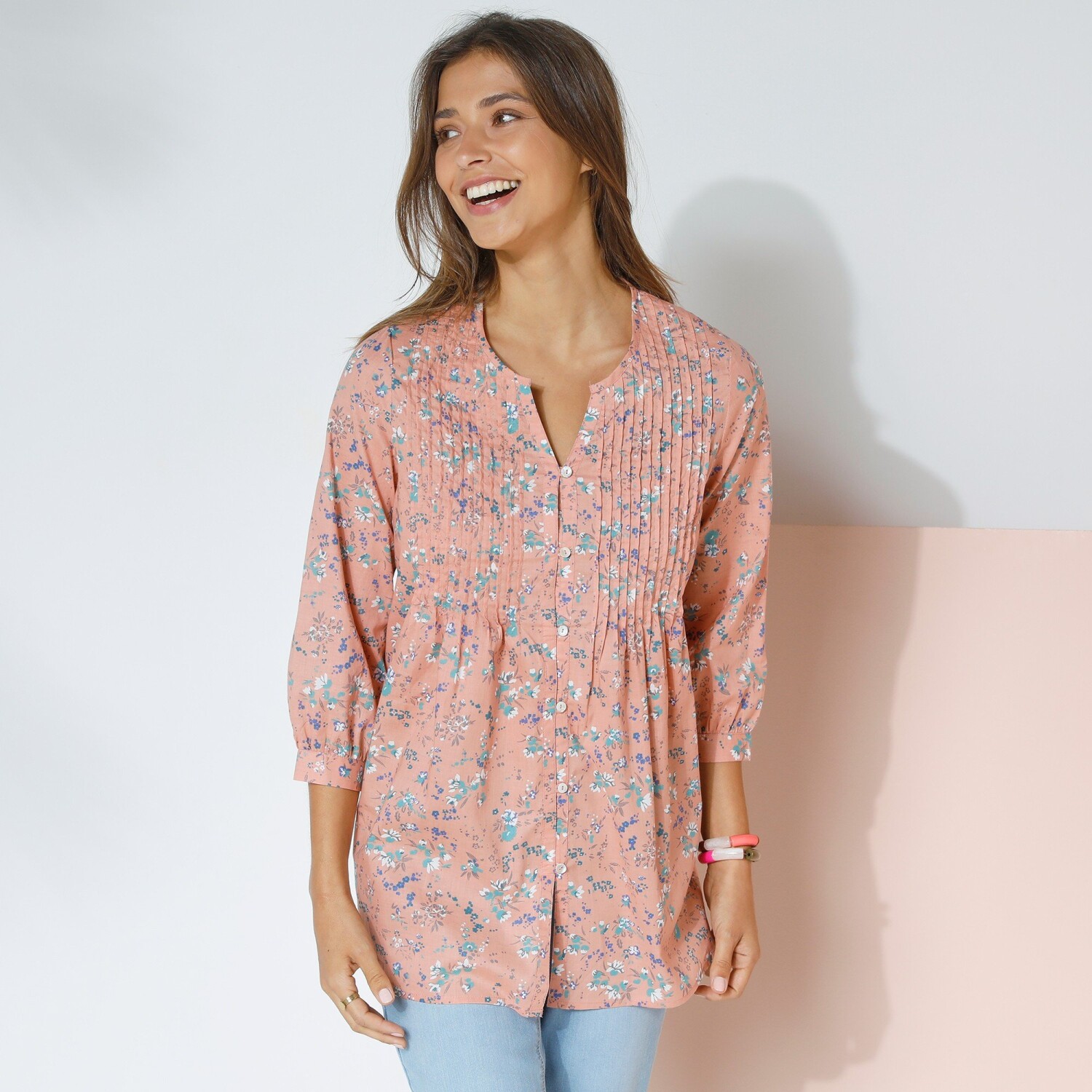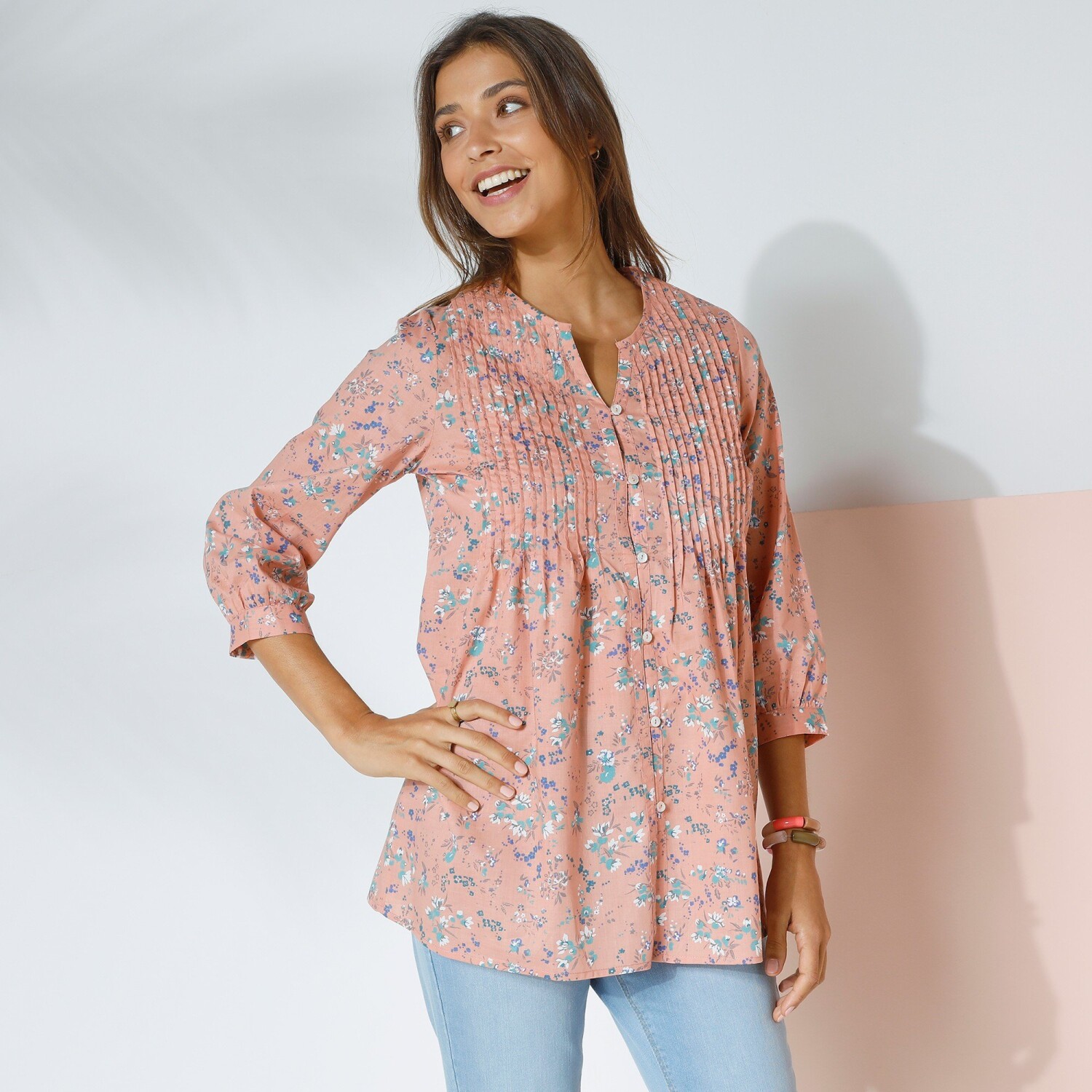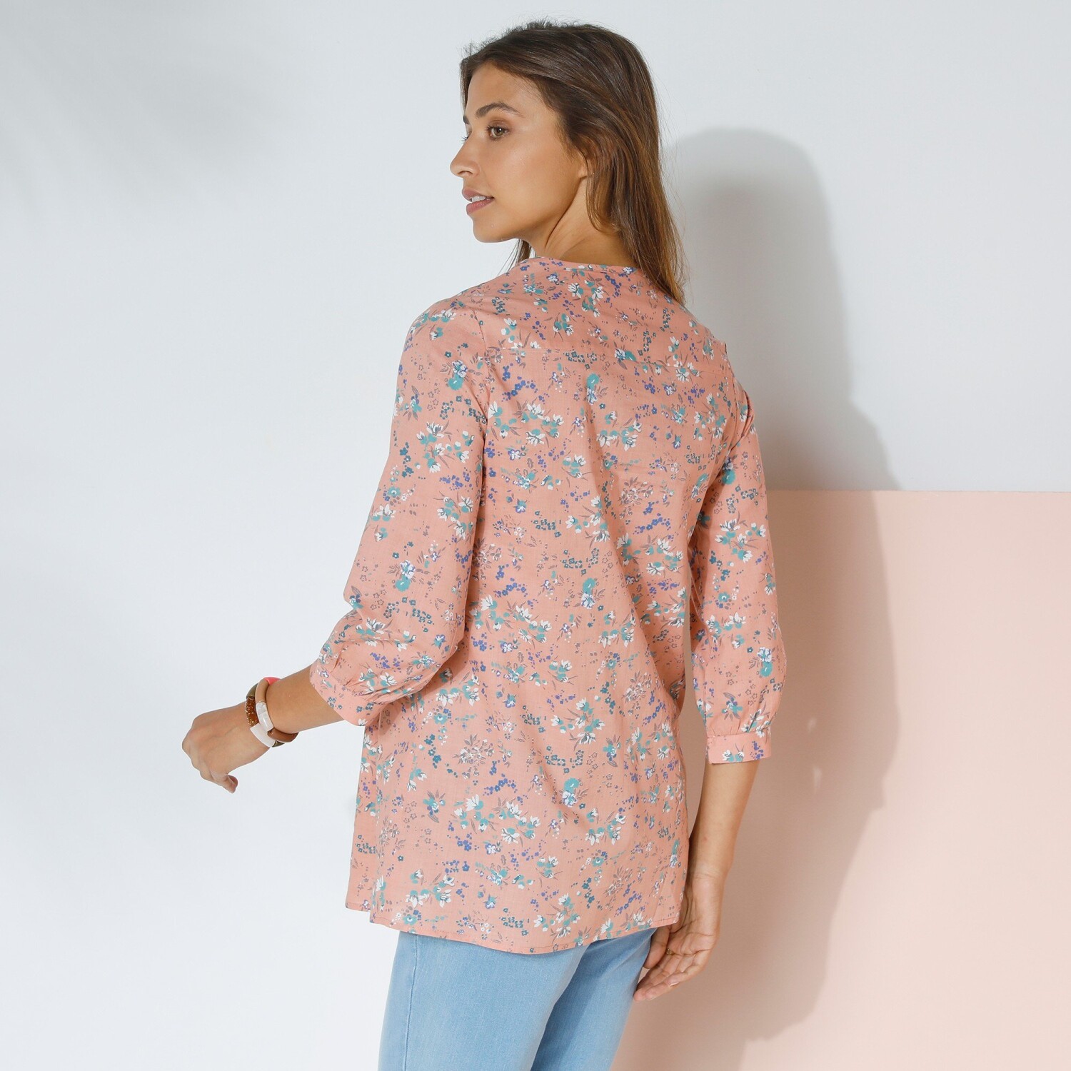 Duża szerokość, fałdy i ładny kwiatowy nadruk: ta tunika wie, jak przyciągnąć uwagę! Okrągły dekolt. Zapięcie z przodu na guziki + oczka. Szerokie rękawy 3/4. Prosty dół. Można prać w pralce.