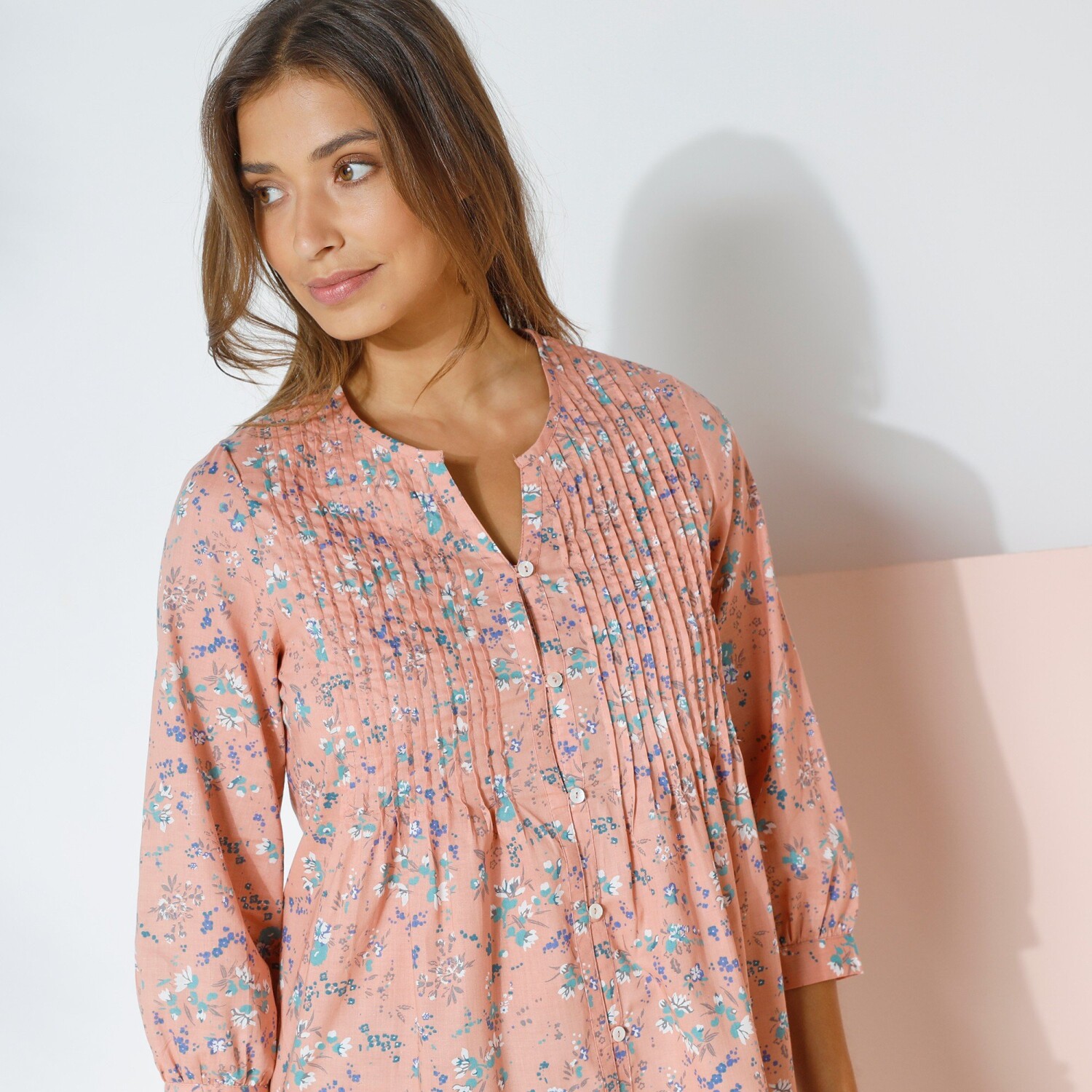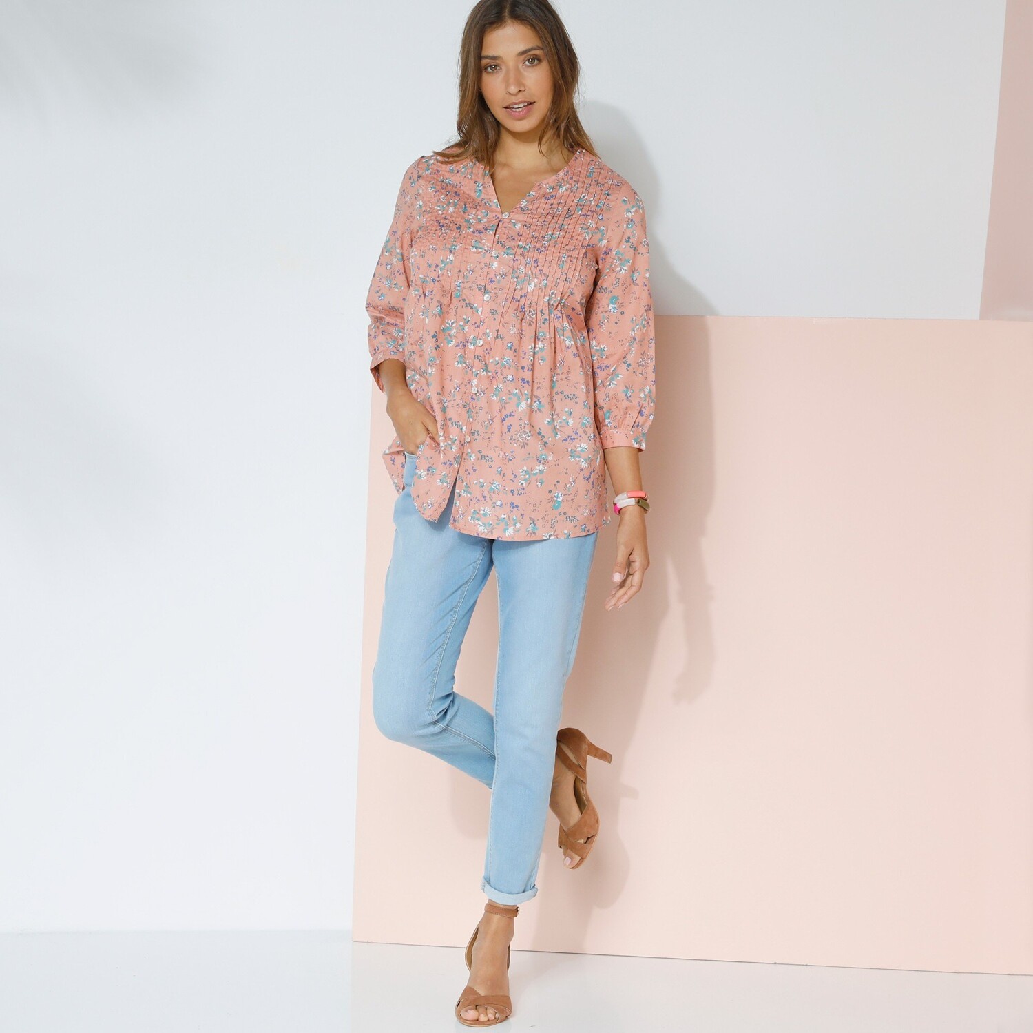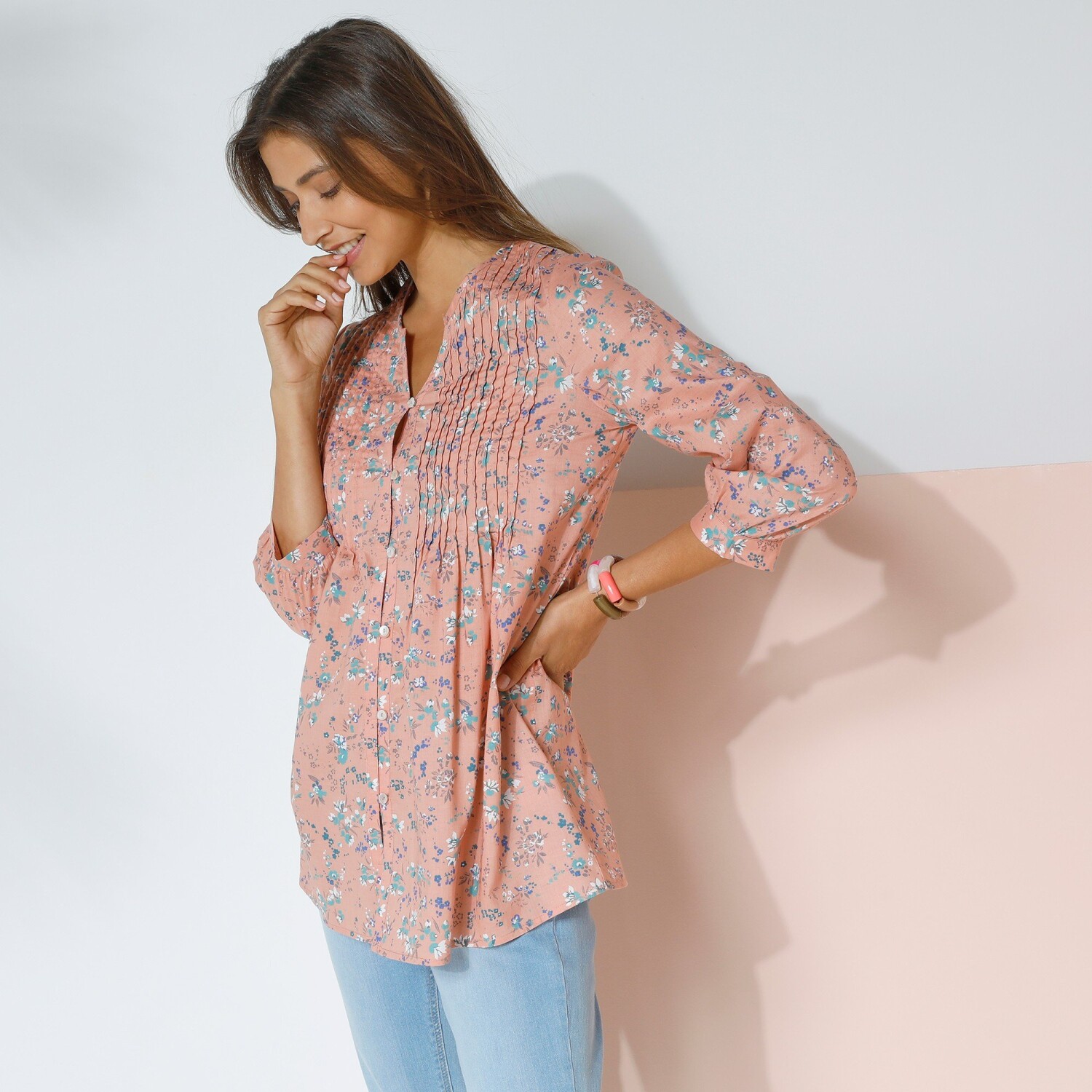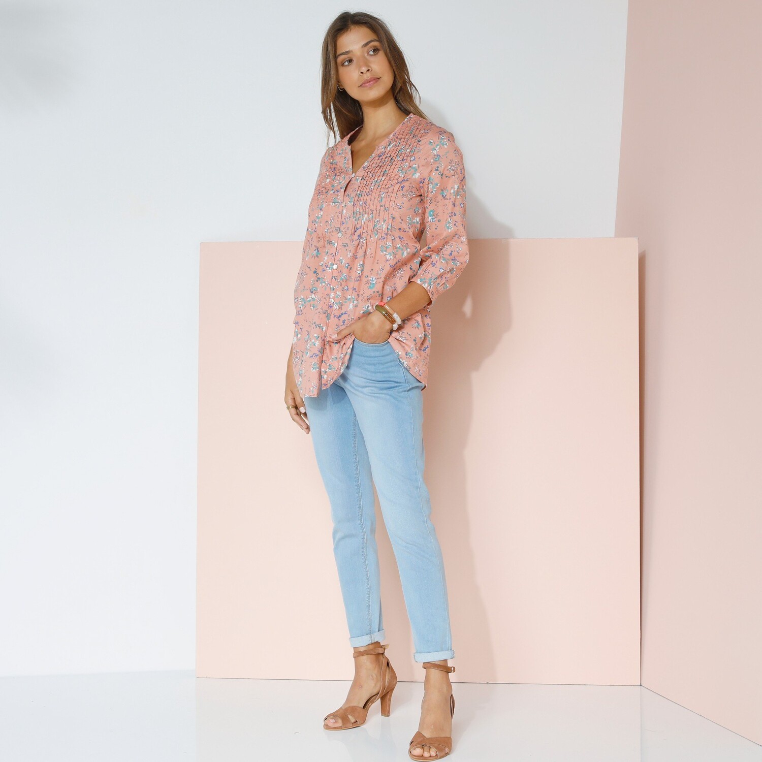 Duża szerokość, fałdy i ładny kwiatowy nadruk: ta tunika wie, jak przyciągnąć uwagę! Okrągły dekolt. Zapięcie z przodu na guziki + oczka. Szerokie rękawy 3/4. Prosty dół. Można prać w pralce.