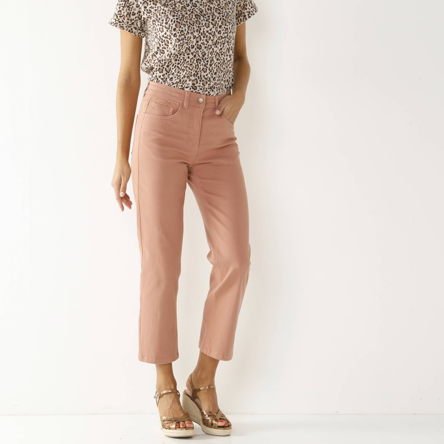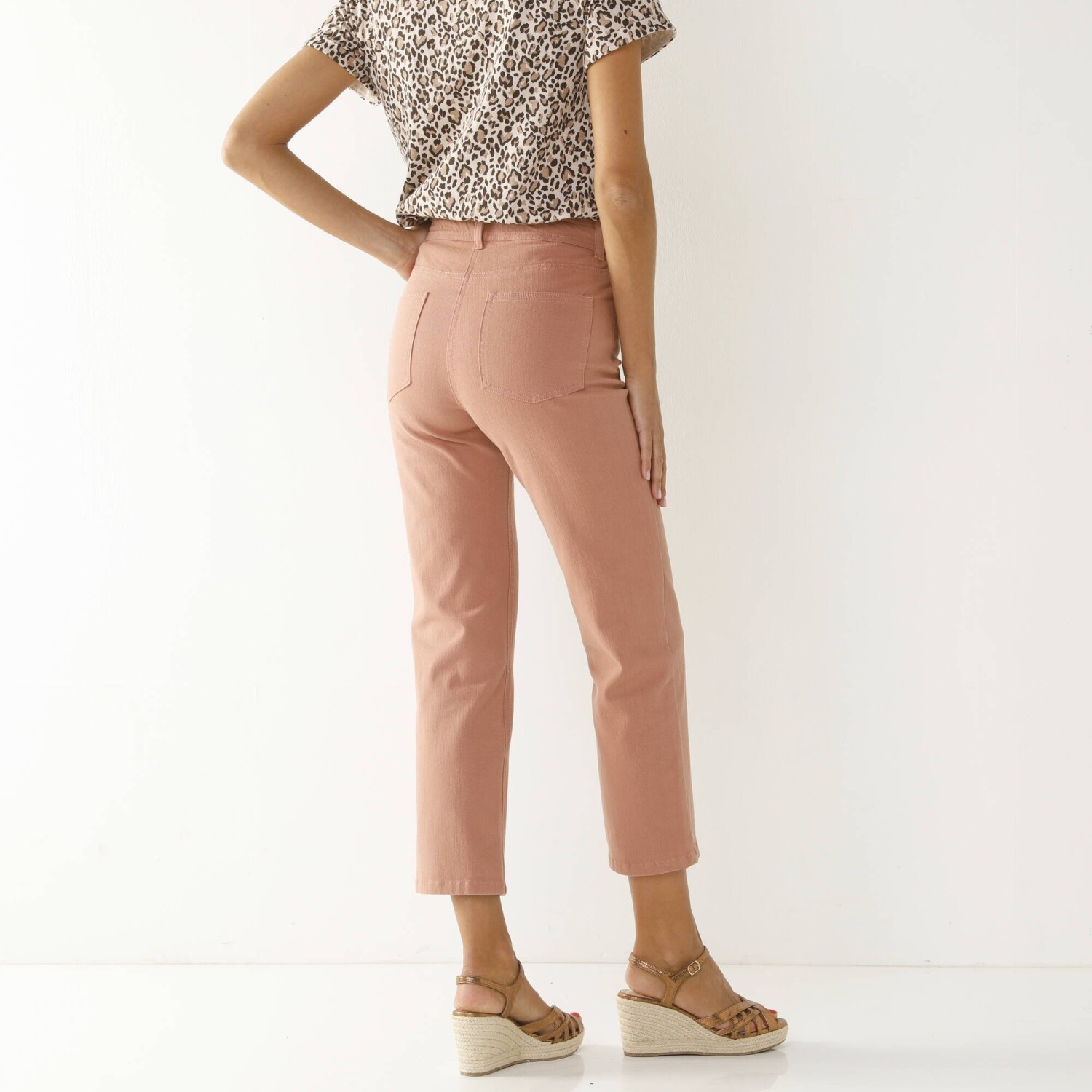 Wzbogać swoją garderobę o wyszczuplające spodnie o długości 7/8, które są równie pochlebne, co wygodne. Regularna wysokość talii. Prosty, lekko rozszerzany krój, łatwy w utrzymaniu. Wewnętrzna regulacja za pomocą elastycznej gumki i guzika. Wyprofilowany pas z elastyczną regulacją po bokach z przodu i z tyłu. Wzmocnienie talii z przodu dla efektu płaskiego brzucha. Zapięcie na zamek błyskawiczny i metalowy guzik. 2 kieszenie i 1 kieszeń z przodu. Uniesiony panel tylny. 2 naszyte kieszenie z tyłu. Certyfikat OEKO-TEX Made In Green. Oprócz weryfikacji kilkuset substancji chemicznych, które przyczyniają się do wysokiego bezpieczeństwa, etykieta ta gwarantuje rozważne zasady produkcji i kontrolowane praktyki społeczne. Można prać w pralce.